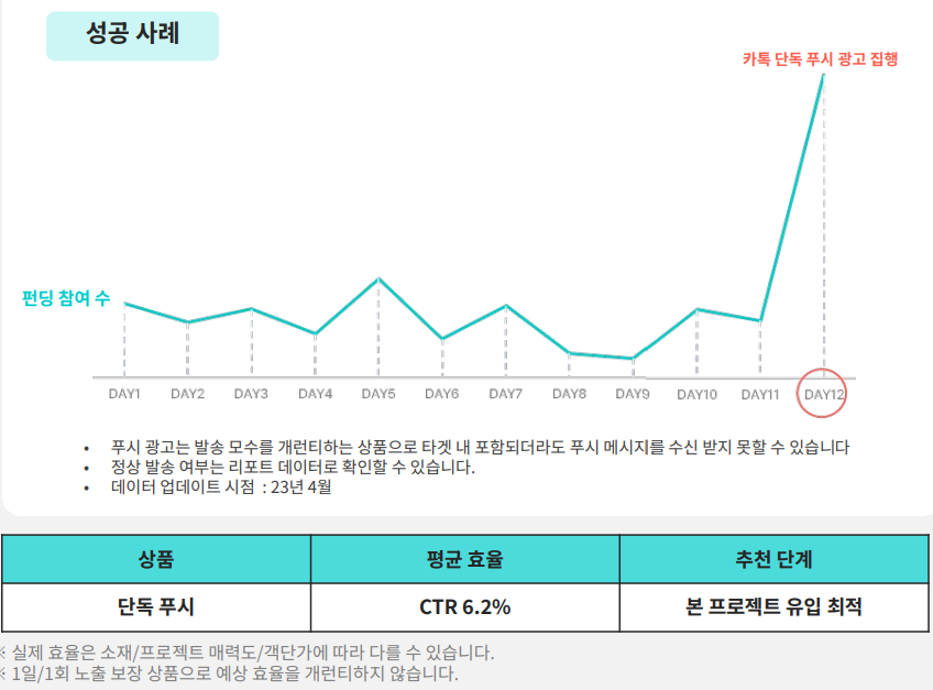 Dies ist ein Produkt, mit dem einzelne Push-Benachrichtigungen über KakaoTalk an 10.000 oder 50.000 maßgeschneiderte High-Engagement-Benutzer (basierend auf Aktionen wie Save notification und Funding-Teilnahme) gesendet werden können.