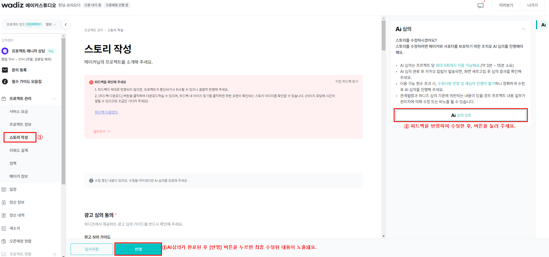 AI 심사는 프로젝트 스토리의 문구와 표현을 광고 심의 기준 및 와디즈 정책에 맞게 자동으로 점검해 주는 기능입니다.