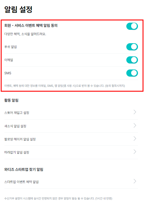 Mein Wadiz > Meine Informationseinstellungen > Benachrichtigungseinstellungen > Zustimmungseinstellungen für Mitglieder- und Service-Eventvorteilsbenachrichtigungen