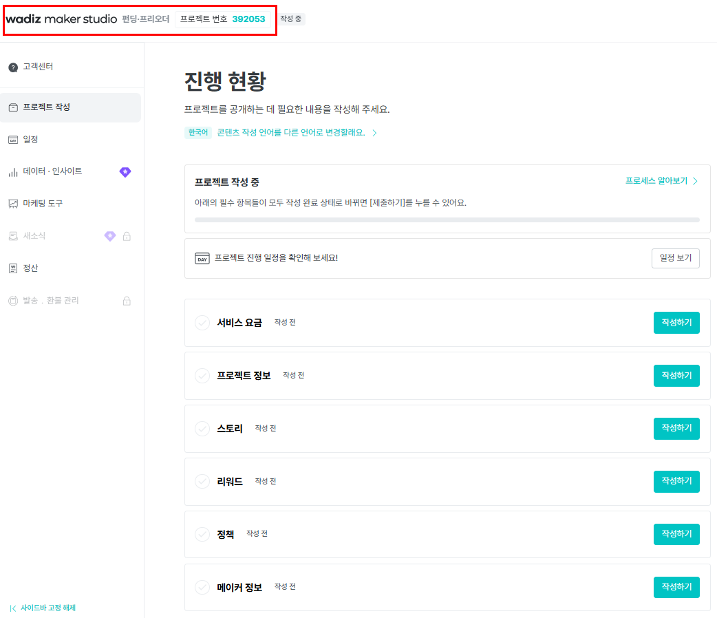 When you are done, click the Submit button to submit the project. We can open the project once it is finally approved after going through a Wadiz review.