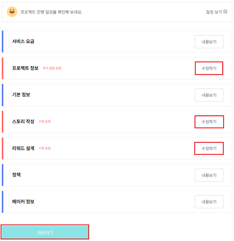 메이커 스튜디오→ [프로젝트 관리]에서 심사 피드백을 확인할 수 있습니다. 수정이 필요한 항목을 확인하여 답변을 작성한 뒤 저장 후 제출해 주시면 됩니다.