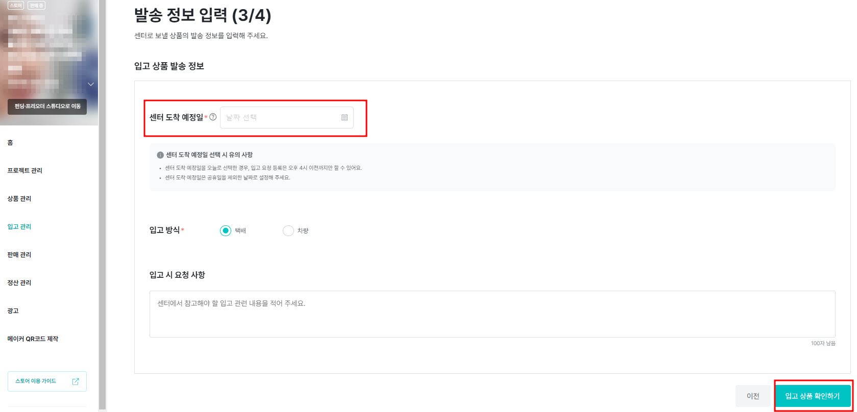 If you select today as the expected arrival date at the center, warehousing request registration is only possible until 4 PM, and please set it to a date excluding public holidays.