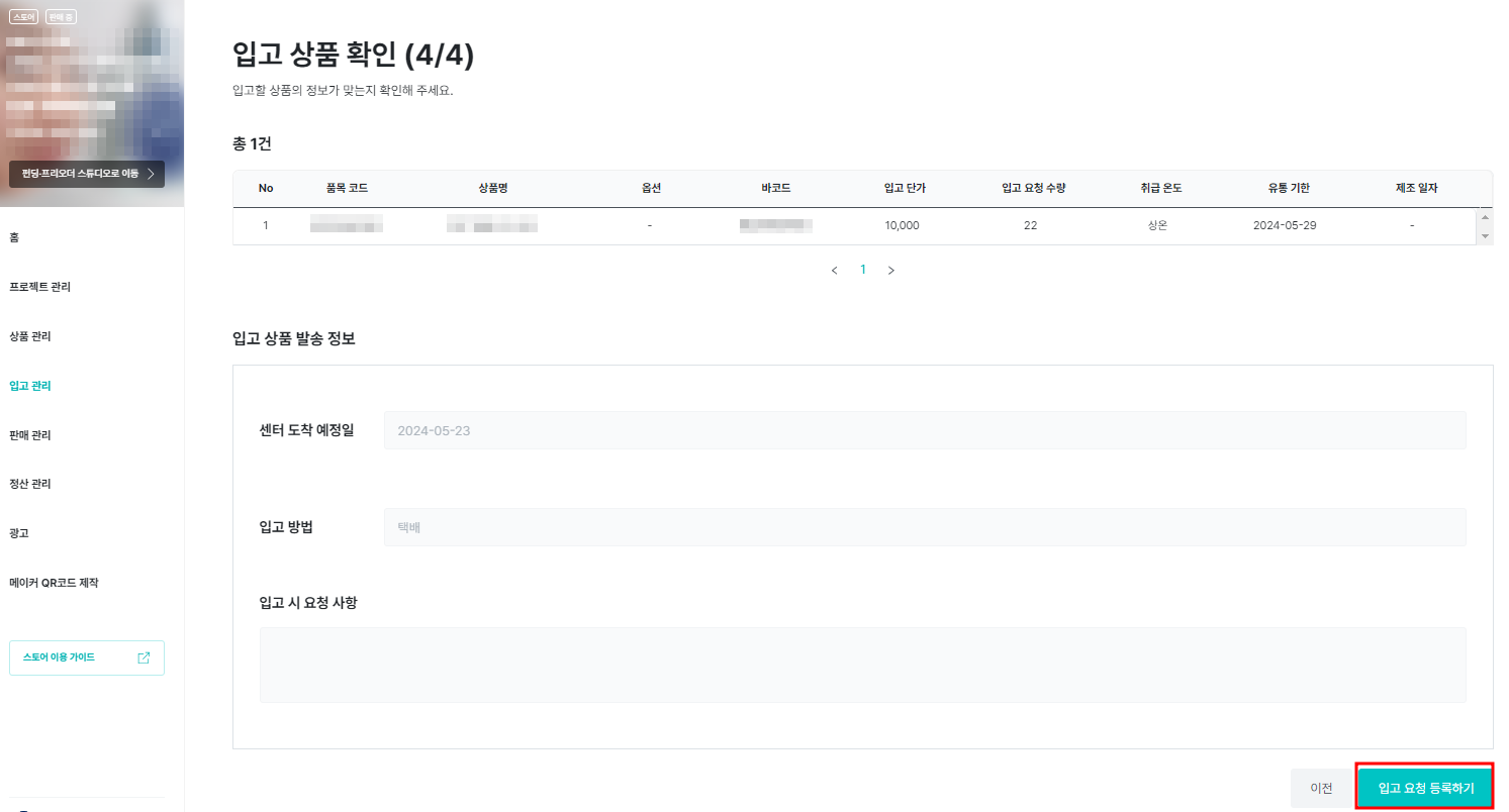 5. Lastly. Check the entered product and shipping information and click [Register Warehousing Request].