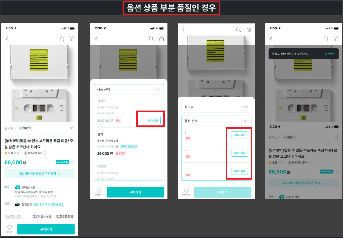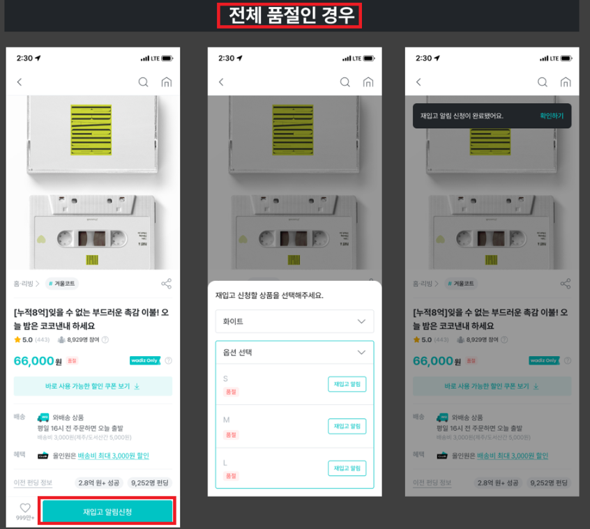 If you apply for [Restock Notification], you will be notified through the Wadiz app when the item is in stock.