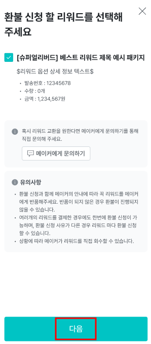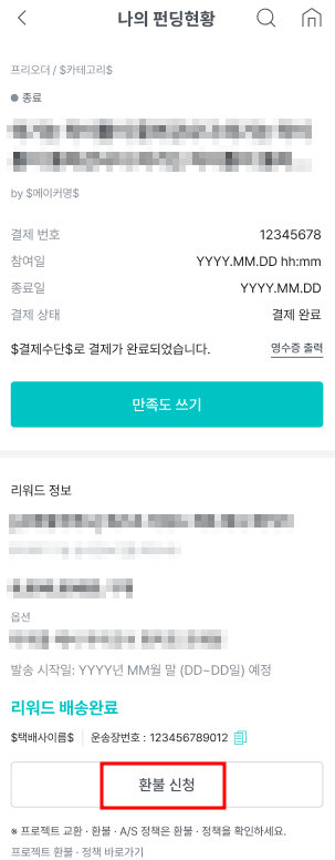 リワード受領後、瑕疵、表示または広告と異なるリワードが発見された場合、配送完了日から7日以内に マイWadizで返金申請が可能です。