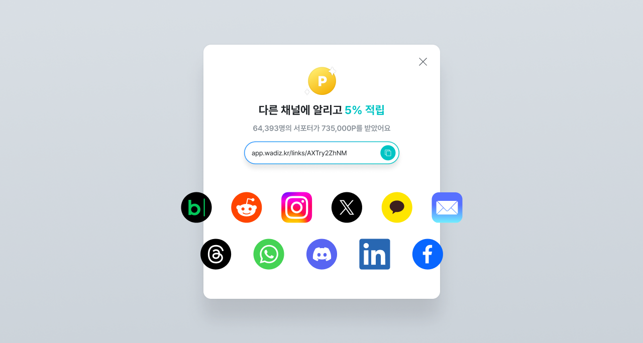 完了した支持署名は、様々な外部チャンネル(SNSなど)で共有できます。 共有された支持署名を見て、より多くの友達がプロジェクトに参加するほど、支持署名共有リワードもより多くもらえます。