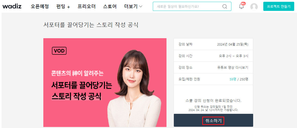 Wadizスクールの申し込みをキャンセルしたい場合は、Wadizメインページの上部にある[詳細]をクリックし、Wadizスクールを選択した後、該当スクールをクリックして[キャンセル]ボタンをクリックしてください。