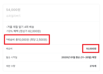 たとえば4ヶ月定期配送が必要で1回の配送料が2,500ウォンの場合、10,000ウォン(2,500ウォンX4ヶ月)をクラウドファンディング参加時、「応援金プラス」欄に必須的に記載できるようにストーリー内容に表記してください。