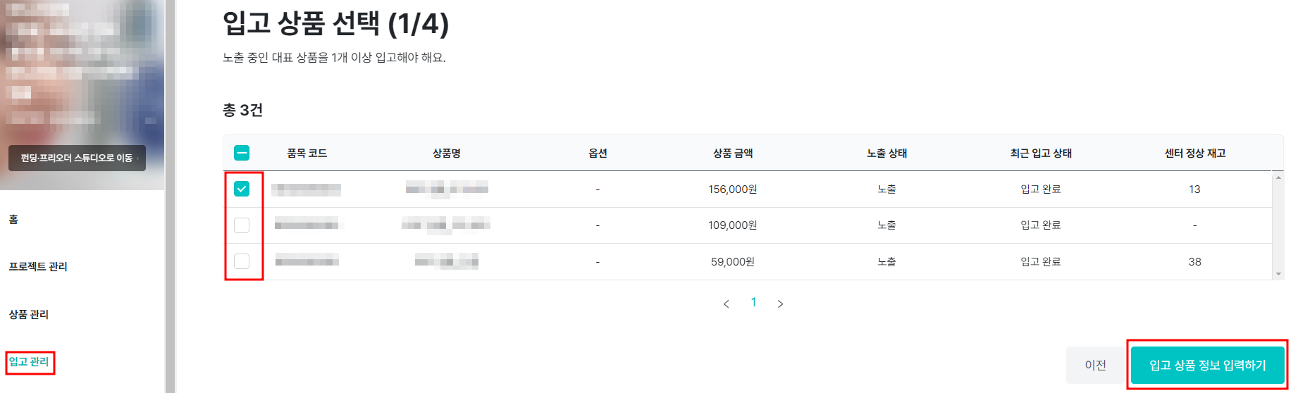 2. 入荷する商品を選択し、[入荷商品情報を入力する]ボタンをクリックしてください。