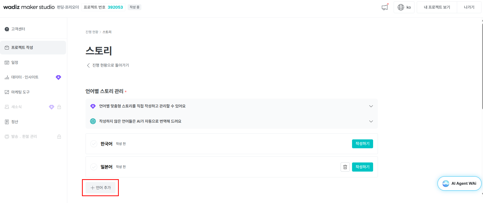 グローバルプロジェクトストーリーは韓国語、英語、中国語(簡体字)、日本語の中から選択した言語で作成でき、作成していない言語はAI自動翻訳を通じて海外サポーターに提供されます。