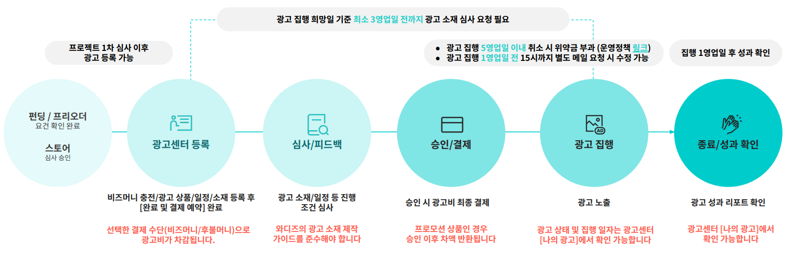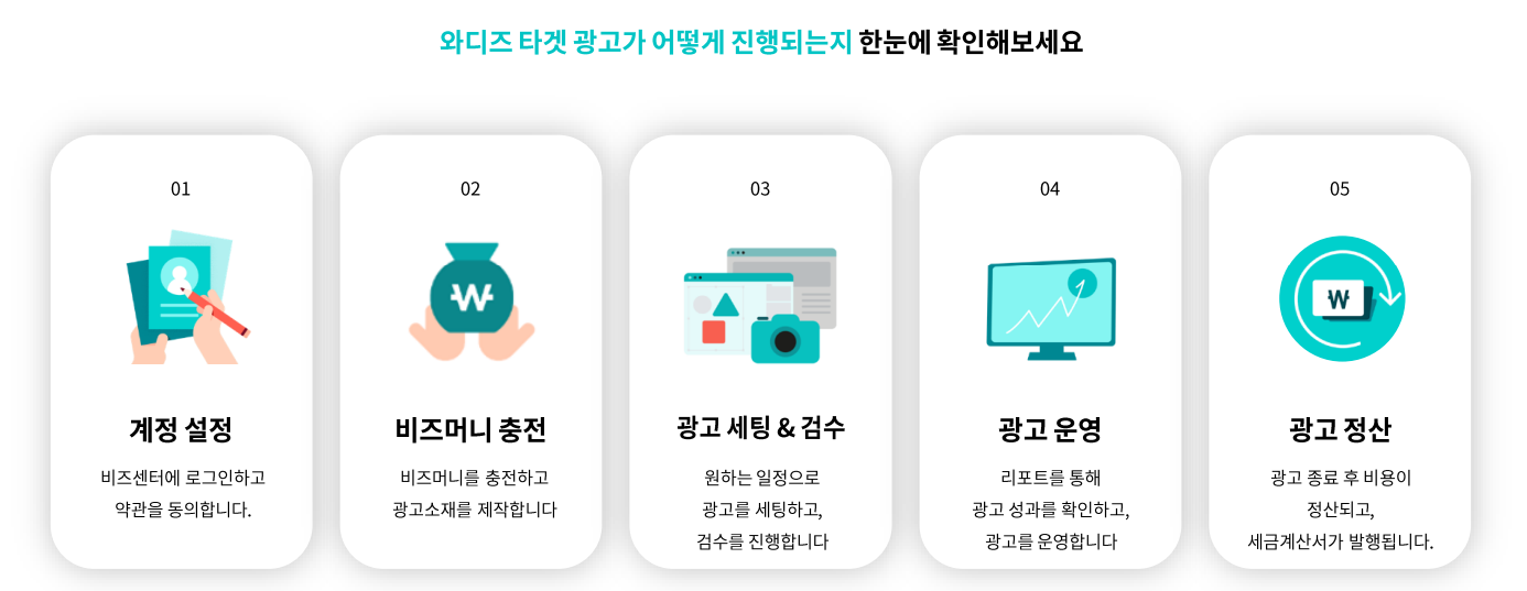 와디즈 광고는 광고 등록 → 심사 및 승인 → 결제 → 광고 집행 → 성과 확인의 총 5단계로 진행됩니다.