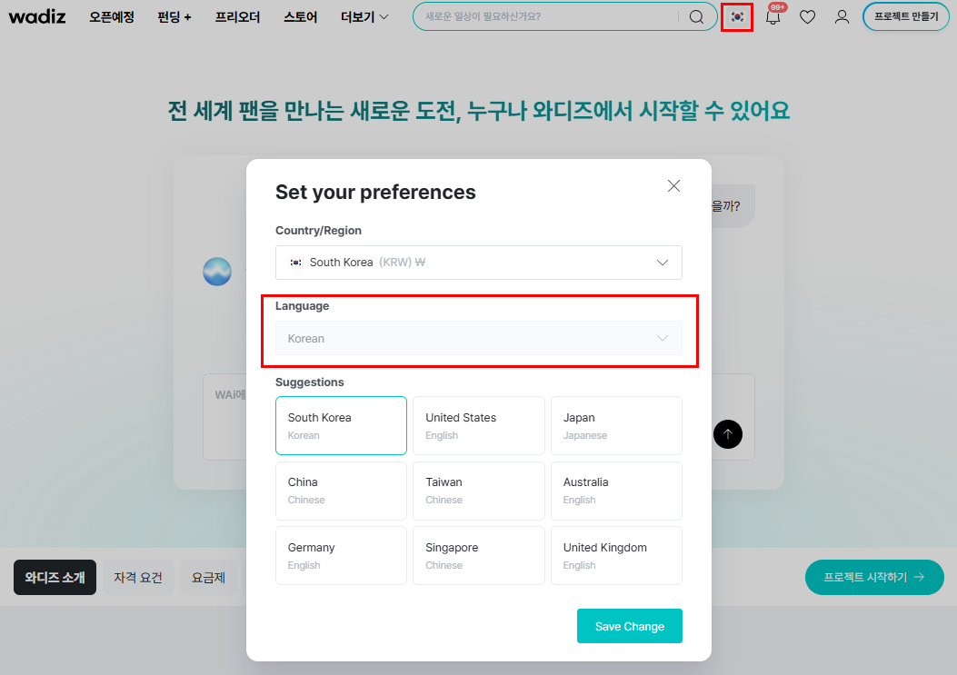 해외 서포터는 프로젝트 상세 페이지 상단의 언어 선택 영역에서 원하는 언어를 선택해 스토리를 확인할 수 있습니다.