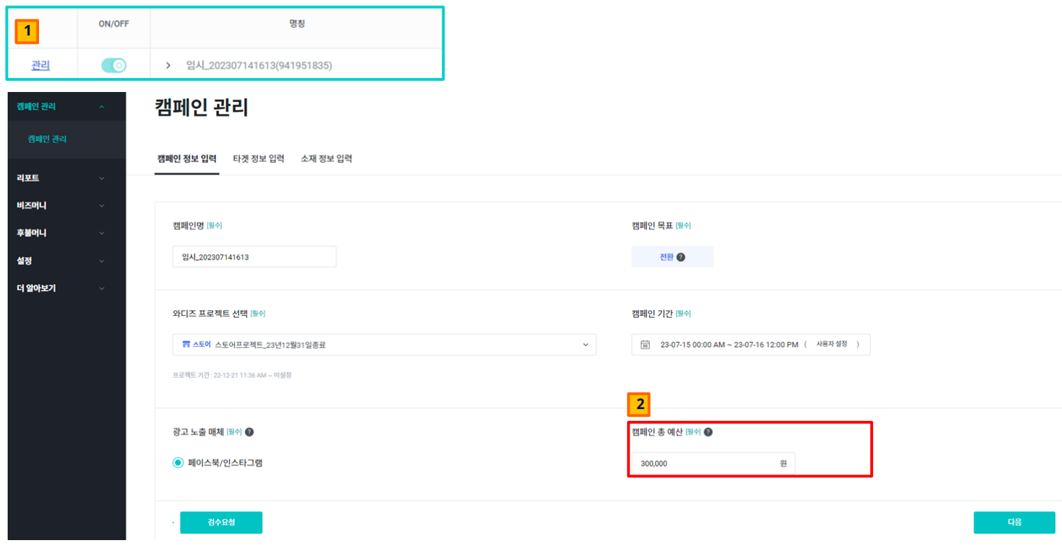- 以活动、广告套装、广告素材为单位,点击ON/OFF图标即可停止或激活。