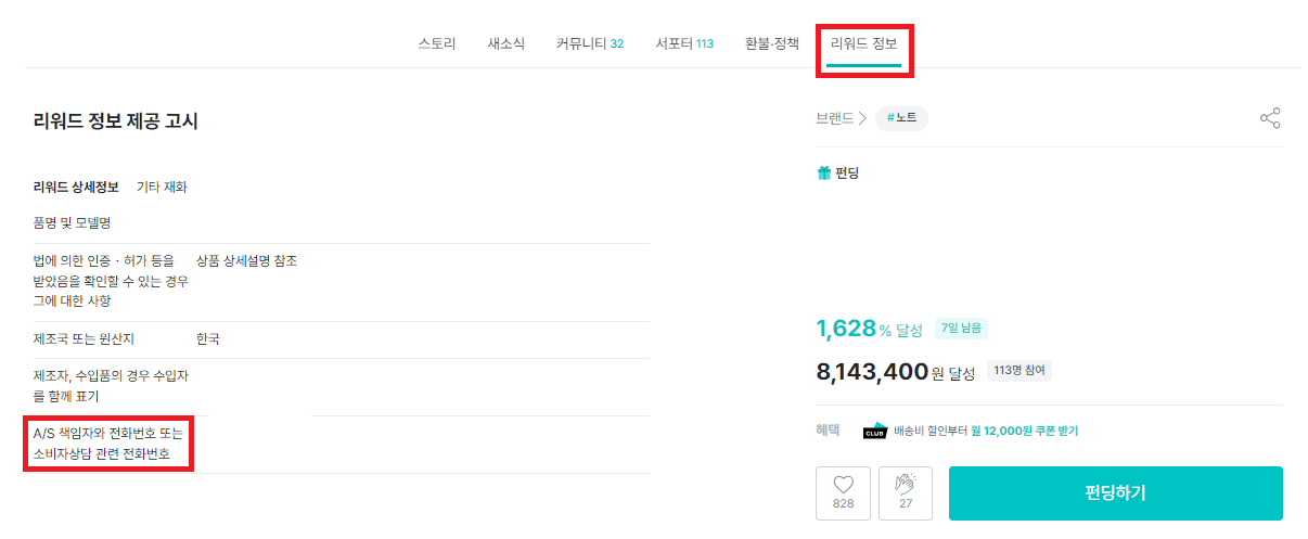 - 可以在项目页面顶部的[回报详情]**中确认A/S负责人和联系方式。