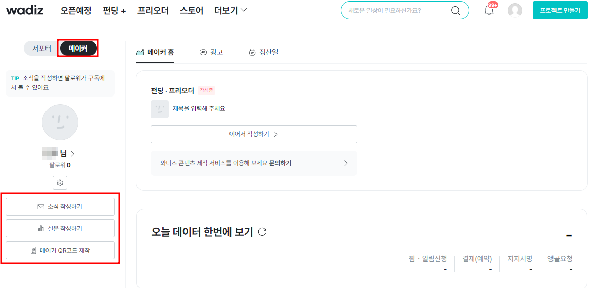 登录Wadiz后,点击我的Wadiz的创作者选项卡,然后点击“撰写消息”即可撰写消息。