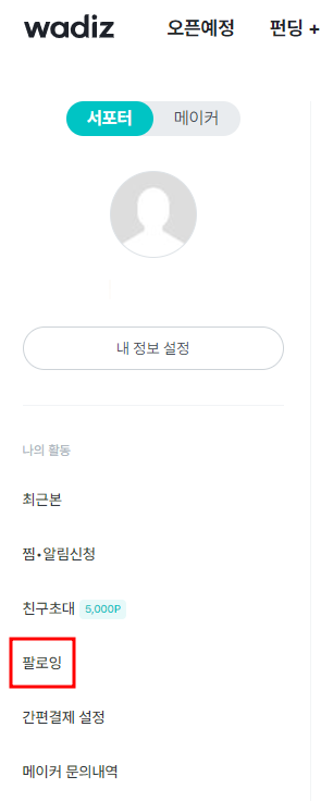 登录Wadiz后,移动到我的Wadiz页面,点击关注选项卡,即可轻松取消关注。