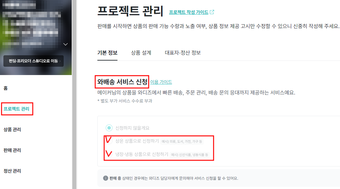 2. 在店铺메이커 스튜디오的[项目管理]菜单中输入基本信息、商品设计、负责人·结算信息后,点击[临时保存]按钮。 勾选[ 와배송服务申请]后,点击[提交]按钮。