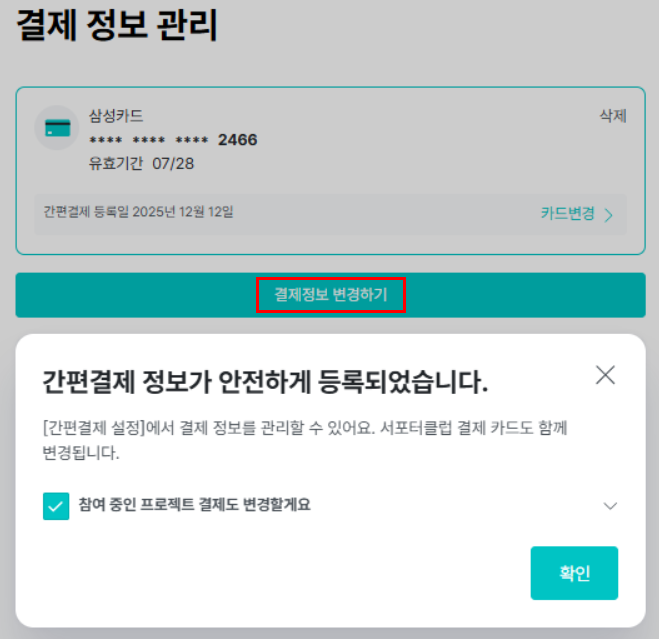 ✅ Wadiz 更改快捷支付迈瓦迪兹→[快捷支付设置可以在]中变更。 如果提前登记简便结算卡,参与项目时可以快速进行结算。但是,快捷支付卡只能注册1张,如果要换成其他卡,必须变更(或删除后重新注册)现有的快捷支付信息。在变更快捷支付信息时,在"参与项目结算也变更"栏目中勾选,随着结算信息的变更,原参与项目的结算信息也会变更。 👉 快捷支付卡变更途径点击Wadiz登录→My Wadiz→快捷支付设置→"更改快捷支付信息" 这篇文章有帮助吗? 是 否 还有其它问题?提交请求